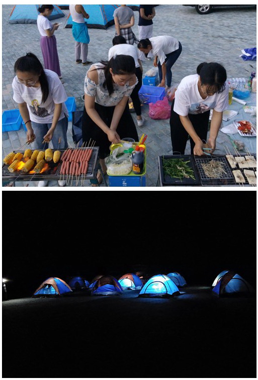 不一会儿工夫,这边一顶顶蓝橙相间的帐篷支起来了,那边炊烟袅袅,烧烤架上的豆腐块、玉米、火腿肠、韭菜、金针菇、茄子等蔬菜已散发出阵阵滋滋作响的烤香味。女同胞们展示了她们独特的天赋,个个变成了烧烤小能手,各显神通,烤出的美味绝不比专业烧烤店的差。除了有烤蔬菜,还有烤鱼、烤鸡翅、烤羊肉串、烤鱿鱼、烤鸡腿、烤馒头等肉类主食,一串串一盘盘让人垂涎欲滴的美食,只要一烤好就立即被瓜分一空。大家或站着围着烧烤摊,或席地而坐,吃着,喝着,聊着,笑着,热情跟随着炭火越升越旺,气氛和谐浓融,尽享一起共处轻松愉悦的美好时光。