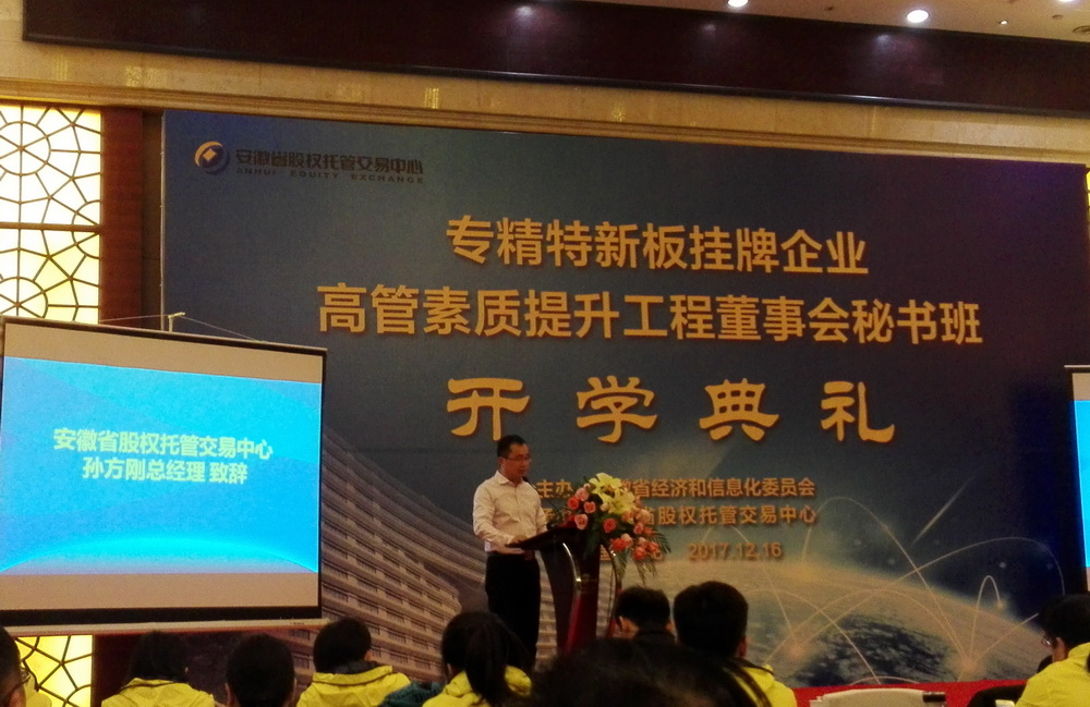 12月16日,省股交中心“专精特新板挂牌企业高管素质提升工程”董事会秘书班开学典礼在合肥两淮豪生大酒店隆重举行,公司副总经理夏海清参加培训学习。
