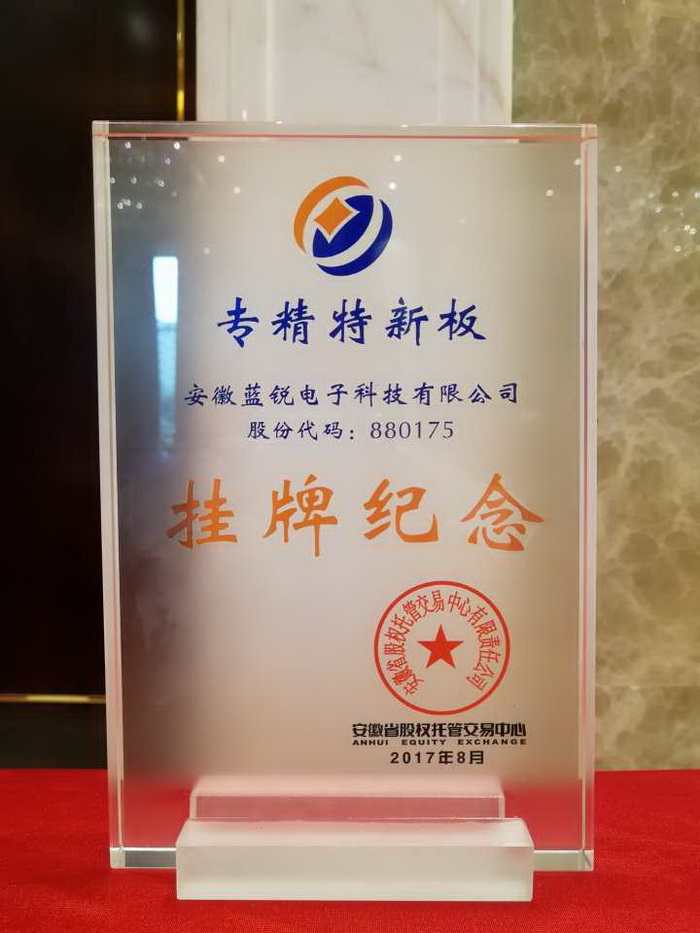 2017年8月25日,由安徽省经信委、省股权托管交易中心合作共建的安徽省“专精特新板”在合肥丰大国际大酒店正式开板,并举行首批企业挂牌仪式。全省首批挂牌企业169家,蓝锐科技作为安庆市优秀的专精特新企业荣为首批挂牌企业之一。