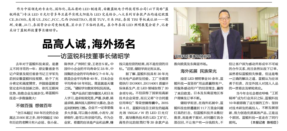 近年来,随着蓝锐科技的蓬勃发展,在国内LED照明业内知名度也越来越广,今年2016泰国国际LED照明展会前夕,中国照明行业主流媒体--《世界照明时报》记者专门来到公司,对公司董事长储昭学进行了专访。